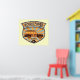 ¡Surf City aquí venimos! Diseño retro Guay con Woodie (o Woody), el icónico vagón de surf con paneles de madera. Aspecto anticuado y vintage. Pegatina del vagón de Woody. Huella de carros.