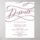 Este póster de postres de boda con texto de borgoña romántico es perfecto para una boda sencilla. El diseño clásico moderno cuenta con giros elegantes y florituras caprichosas con tipografía elegante y escrita a mano.