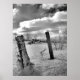El poster "Posts in the Snow" es una imagen de dos postes de madera en la nieve con gruesas nubes esponjosas en un día soleado al fondo. Hecho en blanco y negro.