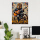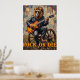 Esta dinámica obra de arte retrata a un león, luciendo sin esfuerzo fresco en gafas de sol y una chaqueta de cuero, "triturando" magistralmente una guitarra eléctrica mientras se cuelga sobre una rueda de vagón. La escena se despliega en una vasta pradera dorada con colinas lejanas bajo un cielo dramático. El grueso y expresivo deterioro crea una textura tangible, haciendo que la declaración "Rock or Die" resuene con la energía cruda de la actuación