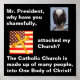 Hay dos fotos en este poster. Uno es un águila calva estadounidense y el otro es un crucifijo católico antiguo sobre la bandera de Estados Unidos. El poster tiene un fondo negro y estas palabras en blanco, "Señor Presidente, ¿por qué ha atacado implacablemente, vergonzosamente, mi Fe y mi Iglesia?" "¡La Iglesia Católica está conformada por muchas personas, en un solo cuerpo de Cristo!"