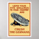 Este vintage poster de la Primera Guerra Mundial muestra una moneda gigante aplastando a un soldado alemán. Dice: "Presta Tus Cinco Muertes A Tu País Y Aplasta A Los Alemanes". Celebre la Primera Guerra Mundial y la Historia Británica con este afiche vintage restaurado digitalmente de The War Is Hell Store. ¿Quieres más productos militares y de historia? Desproteger