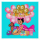 Ilustracion de una adorable bebé vestida de rosa, con el pelo en bollos con arcos rosas y tiara princesa. Rodeado de juguetes y con globos rosados y dorados encima con estrellas y pancartas lunares. Un regalo lindo para los padres que esperan, la ducha de bebé, la revelación de género o el regalo de cumpleaños del bebé.