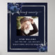 Un fondo azul oscuro, un marco plateado falso, flores azules y espacio para una foto. Personalice y agregue nombre, fechas y su texto.