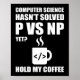 Este divertido diseño de software y desarrollador web de ciencias de la computación dice "¿la informática no ha resuelto aún a p vs np? ¿agárrame el café?". El diseño incluye un café.