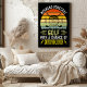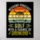 Este ilustracion de estilo retro cuenta con una puesta de sol a rayas en cálidos tonos naranja, amarillo y verde, detrás de una gran bola de golf con texturas y dos clubes de golf cruzados. Debajo de la bola de golf se encuentra el césped verde. El texto superior "WEEKEND FORECAST" se curva sobre la puesta de sol, mientras que "GOLF" se muestra de forma prominente en el centro, con "CON UNA OPORTUNIDAD DE" debajo. El texto inferior "BEBER" está en un amarillo vibrante, flanqueado por pequeños iconos de botellas de cerveza, completando el humorístico pronóstico para un fin de semana relajado.