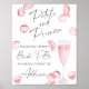 Pétalos de rosa de color acuático elegante con una copa de champán y texto "Petals y Prosecco".
