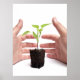 Dos manos protegen una planta joven que crece a partir de un trozo de suelo