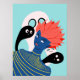 Chica psicodélica espeluznante poster surrealista con un ilustracion vector de un chica alienígena de piel azul, cabello rojo y ojos brillantes, rodeada por sus amigos imaginarios que son lindos fantasmas blancos y negros. Esta extraña obra de arte psicodélica resultará atractiva para una persona a la que le gusta el arte oscuro, raro y extraño y que también es genial para Halloween.