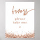 Esta señal de favores presenta lentejuelas de oro rosa falsas y un dúo de fuentes glamorosas. Utilice esta plantilla para editar las fuentes, el color de la fuente y el color de fondo para que se ajusten a las necesidades de su evento. Esta señal es perfecta para su boda, fiesta de soltera o baby shower.