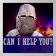 Vista de cerca de un casco y una armadura de placas de un caballero medieval contra el colorido fondo que imita el espacio exterior o un campo de batalla a tu gusto. Texto - ¿Puedo ayudarle - agregado