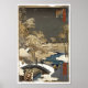 Pintura de arte de estilo vintage con colores de invierno que representa un pueblo antiguo y un puente en la nieve.