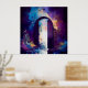 Obra de una puerta que se abre a un lugar lejano. Abra una puerta de entrada a la imaginación con esta impresionante obra de arte abstracta. Una puerta solitaria, silueta contra una vibrante explosión de color cósmico, invita al espectador a entrar en un reino de posibilidades ilimitadas. Ricos púrpura, azules profundos y ráfagas de luz celeste y energía giran alrededor de la puerta, creando una sensación de misterio y maravilla de otro mundo. Una puerta abierta atraviesa un paisaje dinámico y abstracto de colores giratorios, lo que sugiere un paso hacia una nueva realidad o un viaje hacia el yo. Este artículo es una fascinante exploración del abstracto, perfecto para encender la conversación y añadir un punto focal dramático a cualquier hogar moderno. Esta ilustración abstracta se puede personalizar, imprimir y descargar.