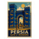 Afiche de viajes retro inspirado en la Antigua Persia y Mesopotamia, mostrando la Puerta de Ishtar. Antecedentes: paredes altas de color azul cobalto adornadas con relieves dorados de leones, toros y dragones. Una caravana de comerciantes y camellos persas caminando por el arco