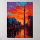 Obra de arte vibrante del horizonte neoexpresionista inspirada en Toronto y la icónica Torre CN. Texturas de pincel audaces y colores intensos de la puesta de sol transforman el horizonte moderno en una dramática pintura del paisaje urbano de la ciudad. Arte mural perfecto para los amantes de Toronto, el arte inspirado en viajes y los horizontes expresionistas contemporáneos.