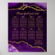 Welcome guests in style with this purple and gold agate marble wedding seating chart, designed to make a striking statement at your reception. Rich jewel-toned purples, organic stone-inspired patterns, and luminous gold accents create a refined and dramatic display ideal for fall or winter weddings. The deep amethyst palette paired with metallic gold detailing complements elegant, modern, and glamorous celebrations while enhancing your décor. This seating chart is formatted for 8 tables and can be fully customized to accommodate additional tables, guest counts, and layout preferences, ensuring a seamless fit for your wedding day.
