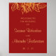 Un poster contemporáneo, muy elegante y de diseño, de color rojo oscuro y boda dorado, que recibe a los clientes en la iglesia (o en la recepción). El diseño tiene un tema rojo oscuro (o borgoña) con un ramo de flores dorado y hojas en la parte superior.
