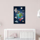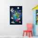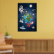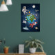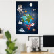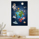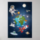 Lo que está pasando alrededor del planeta Tierra, una vista desde el espacio. imagen poster con cohete, astronauta, satélite, luna, etc...
