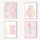A combination of soft, quilt inspired designs, and a flower creates this cute, bedroom wall decor art print. The background is light pink, while the flower consists of white with light shades of green, yellow, and pink. This art print features a signature by me, the artist.