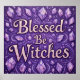 This vibrant poster features a magical and whimsical aesthetic. The central focus is the text "Blessed Be Witches" rendered in ornate, golden letters. The background is a deep purple, and is filled with numerous stylized crystals in varying shades of purple and lavender. These crystals are faceted and have a glowing effect, suggesting light coming from within. Reminiscent of fantasy and or occult-themed art. The impression is one of enchantment and positive energy, aligning with the phrase "Blessed Be," a common greeting among practitioners of Wicca and other NeoPagan traditions. Finished in an oil paint art print.