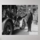 Old photo of President Calvin Coolidge with radio equipped antique car, 1920s.