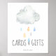 Esta nube de niño de la lluvia, tarjetas de bebé y señalización de regalos, es perfecta para una ducha moderna de bebé o rociado de bebé. El diseño es bonito y sencillo, con gotas de lluvia verde azuladas de color pastel, azul claro, amarillo y gris que caen de una suave nube gris.