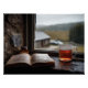 A steaming cup of tea, an open book, and the soft patter of rain beyond the window—this scene is pure soul-soothing magic. Gaze through the glass to a cozy countryside cabin, and let the peaceful stillness wash over you. Perfect for bibliophiles, introverts, and anyone who knows the joy of a rainy day read.