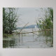 Un primer plano de una rama parcialmente sumergida en aguas poco profundas, con cañas altas enmarcando la escena. A lo lejos se ve un velero. Principalmente verde