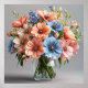 Una impresionante disposición floral con flores rosas, azules y melocotón hermosamente exhibidas en un jarrón transparente, perfecto para decoración, bodas y crear una atmósfera tranquila.