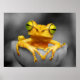Fotografía en blanco y negro con una linda rana amarilla con grandes ojos verdes y dedos gordos, sentada en medio de un tomate hueco.