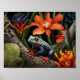 Rana de dardos verde ilustrada en las ramas de árboles rodeados de flores tropicales vibrantes en un bosque tropical lluvioso.