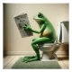 Una gran rana verde está sentada en un baño, leyendo un periódico titulado "The Daily News"
