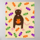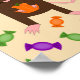 Este poster presenta una imagen gráfica de una linda rata marrón con la cola y los pies de las orejas rosas. La rata sostiene una calabaza naranja entre sus patas. Alrededor de la rata hay una colección de dulces verdes, morados y naranjas. Este diseño es perfecto para cualquier amante de las ratas o propietario de esta Halloween.