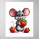 Un lindo ratón gris está de pie y sostiene fresas maduras y deliciosas en sus manos.