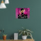 Divertido DJ de hip hop fiesta chica, vestido con pantalones cortos y camiseta de tanque con el pelo salvaje, bailando en una multitud fiesta con mesas redondas delante de ella. Luces de polka magenta brillantes con luces intermitentes. Un fondo floral rosa a gris.