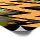 El diseño presenta una composición audaz al estilo cómico, dominada por formas grandes y con forma de relámpago en naranja dorado, que recorren diagonalmente el lienzo. Estas formas nítidas están delineadas en negro, creando un sentido de poder e intensidad. El fondo combina el negro profundo y el gris oscuro con rayas verticales de verde oliva y rojo oscuro, lo que añade profundidad y contraste. Las chispas dispersas de naranja dorado aumentan la impresión de velocidad, energía y movimiento explosivo. En general, la obra transmite una escena dramática y de alto impacto que recuerda al manga o a los efectos de la acción cómica.
