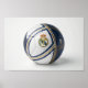 Arte mural: Un diseño de un futbol elegante y elegante, donde el escudo del Real Madrid se integra creativamente en el balón. La bola tiene líneas limpias y entrelazadas, destacando los colores reales del blanco, el oro y el azul marino.
