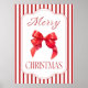 Poster de Navidades festivos con un audaz arco de cinta roja y fondo rayado rojo y blanco. Perfecto para añadir un alegre encanto vacacional a su sala de estar, entrada o evento de temporada.