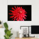 Un poster de una hermosa dahlia de cactus rojo brillante, muchas de ellas en un fondo negro.