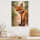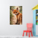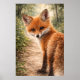 A young red fox kit pauses on a woodland trail and turns with a calm, alert gaze. Soft foliage and muted forest tones frame the close-up scene, creating a quiet wildlife image with a sense of awareness and stillness. AI-assisted artwork.