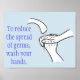 Estos posters presentan un ilustracion de manos de jabón bajo un grifo de agua corriente. A la izquierda del dibujo está el texto - Para reducir la propagación de gérmenes; lávese las manos. El color de fondo del azul claro se puede personalizar a un color de su selección. Gracias por comprar CherylsArt en Zazzle.