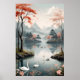 Un paisaje sereno de suaves montañas y un tranquilo lago, adornado con cerezos con vibrantes flores rojas. Los cisnes blancos desfilan a través del agua, creando una escena de paz y belleza natural. Una invitación a la contemplación y al descanso.