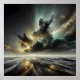 Esta obra de arte inmersiva te transporta a un universo paralelo, donde nubes cósmicas en tonos de interlinos verdes y negros con rayos dorados y estrellas brillantes. El horizonte refleja todo este esplendor, creando una simetría hipnótica entre el cielo y el mar. Es una invitación a la contemplación: la tensión de las tormentas celestes se mezcla con la calma de un refugio etéreo, perfecto para los que buscan inspiración más allá del día a día.