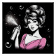 Una mujer elegante, a mediados del siglo XX, sostiene una lata de aerosol en la mano derecha. Su voluminoso cabello, meticulosamente estilizado, sobresale en un fondo negro. Unas burbujas extravagantes flotan a su alrededor, lo que contribuye a una atmósfera divertida, pero sofisticada. Esta obra de arte es un tributo al glamour icónico de una época pasada.