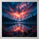 Un paisaje cautivador que representa una tormenta eléctrica vibrante que ilumina el cielo crepuscular sobre un lago forestal tranquilo