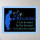 A magician spews the symbols of major religions from his lantern and is illustrated with the saying "Religion, a tool invented by the powerful to control the stupid."