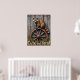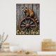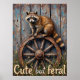 Esta pintura única captura un mapache con su curiosa mirada fijada hacia delante, sentado sobre una vieja rueda de vagones de madera acristalada. La rueda descansa sobre una pared de madera texturada. Las gramíneas y otras plantas brotan alrededor de la base de la rueda. La frase "Cute pero salvaje" se muestra de forma prominente en un juguetón tipo de letra amarillo en la parte inferior.