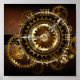 Antiguo, fantásticos relojes con engranajes de oro y latón sobre un fondo marrón y oxidado. Estilo Steampunk.