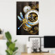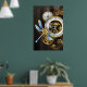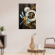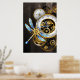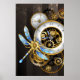 Diales antiguos con artes de oro y latón, decorados con libélula mecánica sobre fondo marrón, rayado. Steampunk.