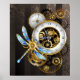 Diales antiguos con artes de oro y latón, decorados con libélula mecánica sobre fondo marrón, rayado. Steampunk.